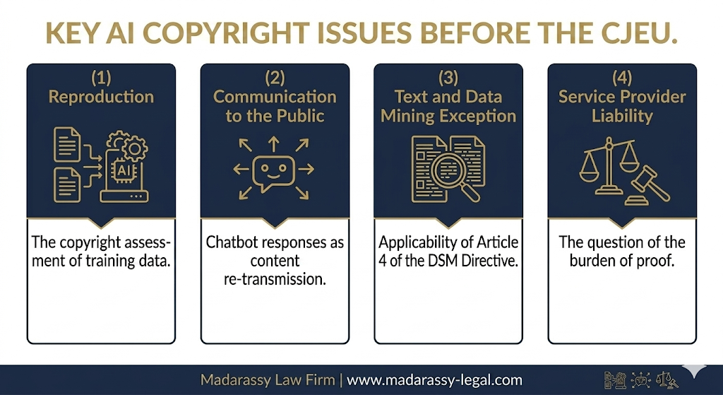 The questions referred by the Hungarian court rest on four pillars. First: does the machine processing of original texts during training constitute reproduction under EU law? Second: if protected content is recognisable in a chatbot’s response, can that be considered communication to the public? Third: does the DSM Directive’s general TDM exception apply to commercial text mining for AI? Fourth: if infringement is established, under what liability framework can it be attributed to the service provider? The last question is particularly noteworthy, as it raises the prospect of reversing the burden of proof — requiring the AI provider to demonstrate that its operations are lawful.