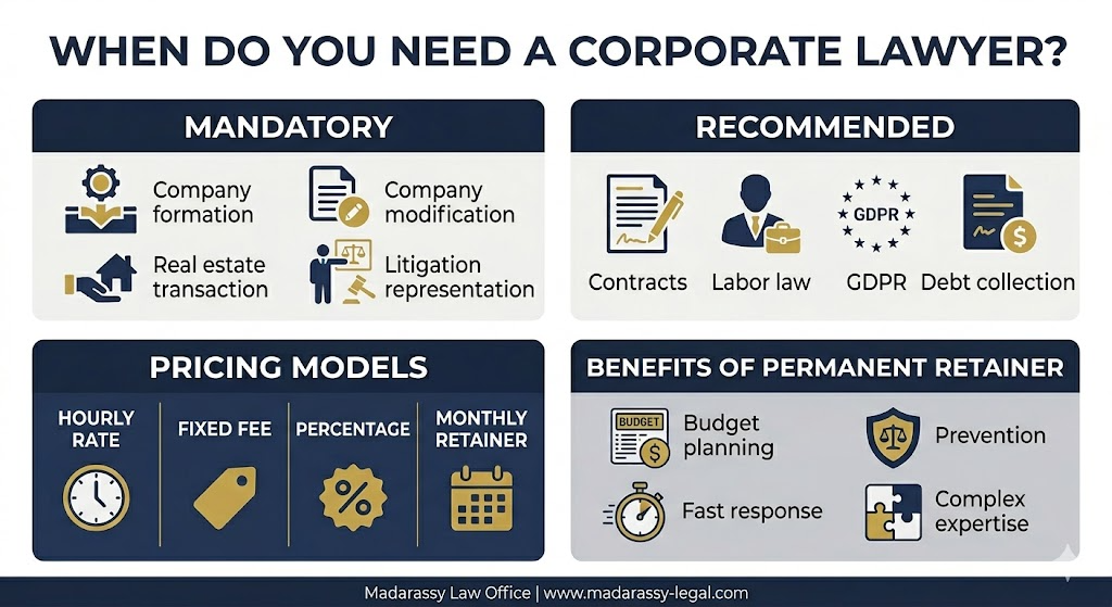 With the entry into force of the Attorney Activities Act (Act LXXVIII of 2017, known as “Üttv.”), the number of proceedings requiring mandatory legal representation in Hungary rose to 99 — a figure unmatched across Europe. Yet hiring a corporate lawyer in Budapest is not a luxury but a fundamental requirement for the day-to-day operation of any business. Poorly drafted contracts, employment law oversights and unreported changes in company data can result in penalties running into millions of forints (approx. EUR 2,700 per HUF 1 million). This guide walks you through everything you need to know before choosing a lawyer for your company.