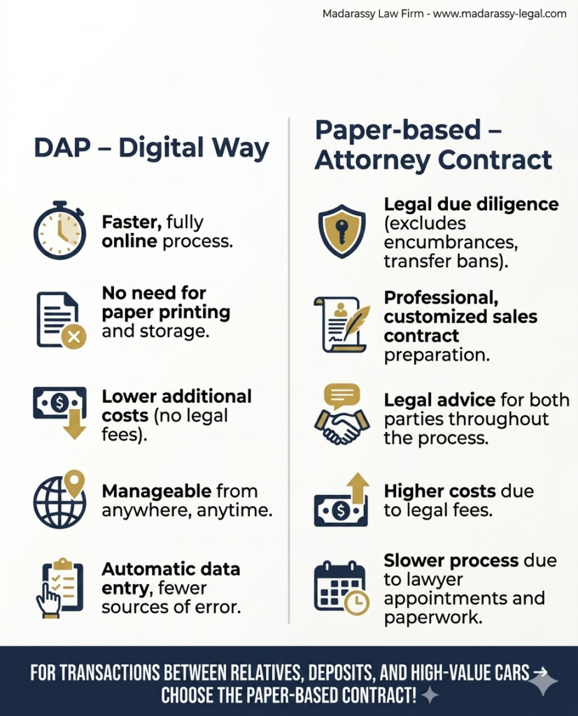 The built-in process can cut the administrative work down to 10–20 minutes. No need to print four copies, no need to find witnesses, and no queuing at the government office (kormányablak). In our firm’s experience, for straightforward transactions this solution is genuinely efficient and reliable.
