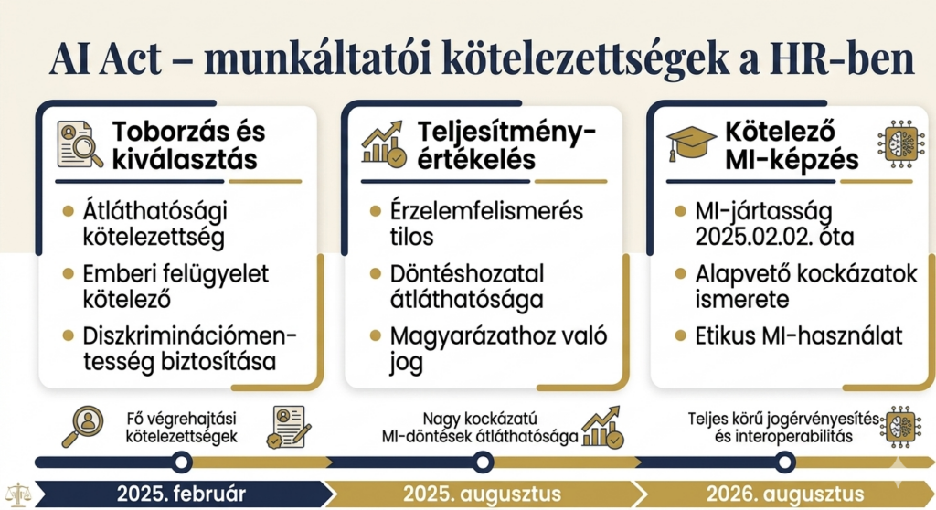 A munkavállalókkal kapcsolatos MI-használat során az AI Act mellett a GDPR és a Munka Törvénykönyve adatvédelmi rendelkezéseit is maradéktalanul be kell tartani. A munkáltató a munkavállalótól kizárólag olyan személyes adatot kérhet, amely a munkaviszony létesítése, teljesítése vagy megszűnése szempontjából lényeges. Az AI Act HR kötelezettségek tehát nem önálló szigetként működnek — a jogszabályok rendszere komplex, és a megfelelés is csak együttesen értelmezhető.